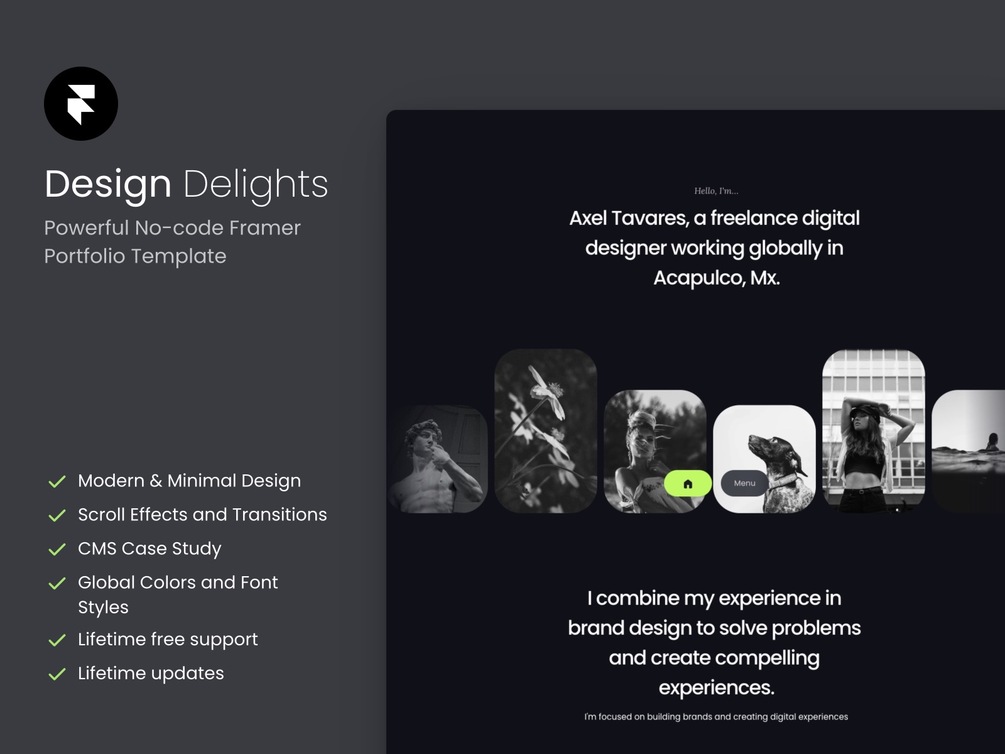 Built entirely with Framer, this template doesn't use a single line of code. Showcase your personal work with this dark, minimal, fully responsive portfolio.